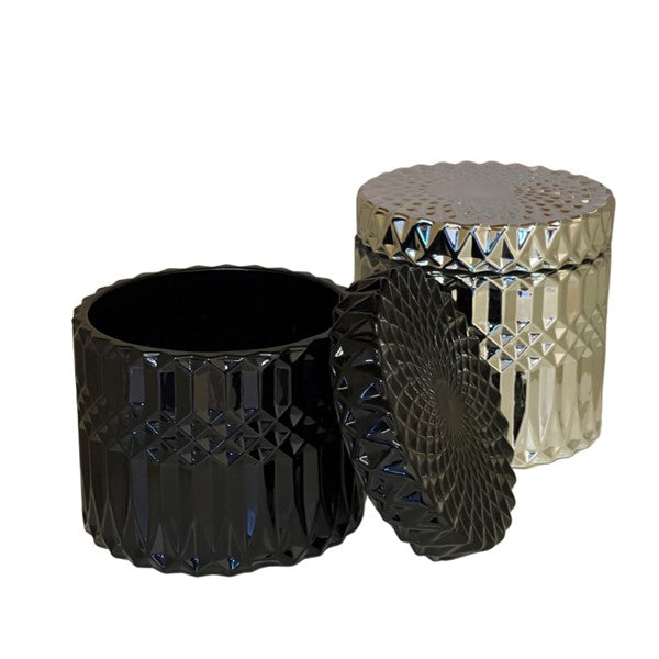 These beautiful two piece vessels will make wonderful luxury candles! Available in Silver or Black! These are large!! 11 ounce capacity. 4.07" tall with lid and 4.125" diameter.