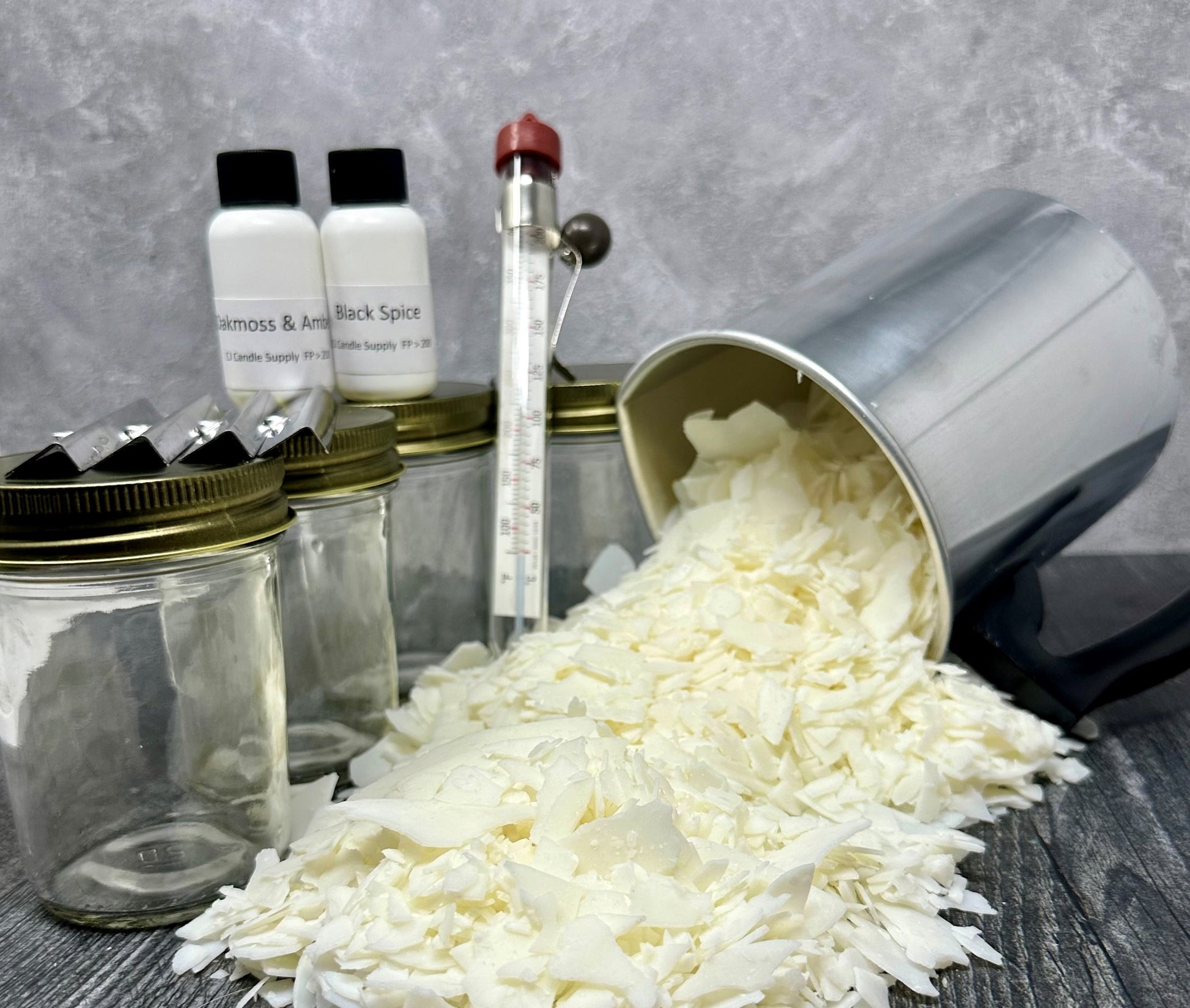 Kit contains 2 of our most popular fragrance oils (Choose from the Musky set which is Oak Moss and Amber and Black Spice, or our Yummy Bakery set which is Lemon Blueberry Danish and Banana Nut Bread) GW 444 wax, 4 each of candle jars, wicks, wick stickers, wick centering bars and warning labels. Additionally it includes a reusable pour pot and thermometer!